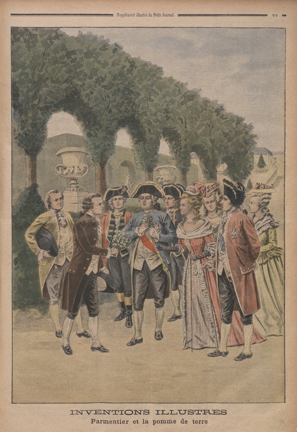 С этим связаны две истории. Во-первых, однажды во время обеда в честь короля Людовика XVI Антуан-Огюст Пармантье подарил королю и королеве букет из картофельных цветов. Мария-Антуанетта украсила цветком свою прическу, и так картофелем заинтересовалась аристократия. На обеде, кстати, подавали блюда из картофеля, а затем Пармантье и сам устраивал званые ужины, на которых можно было попробовать картофель во всех возможных видах.