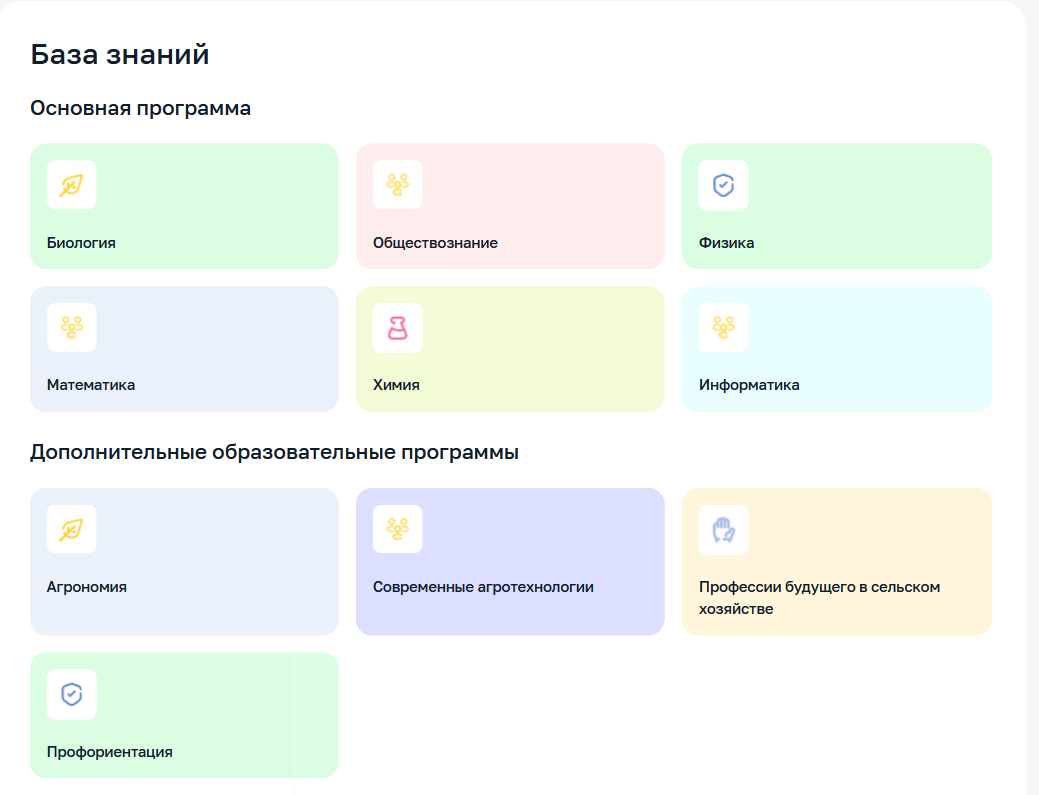 В меню слева есть вкладка «База знаний». Внутри есть разделы с дисциплинами. Выберите одну из них и увидите тематические блоки. Внутри блоков — уроки.