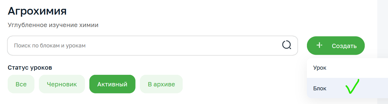 Создайте внутри новый блок или воспользуйтесь уже созданным. В этом блоке нажмите на кнопку «Создать урок».